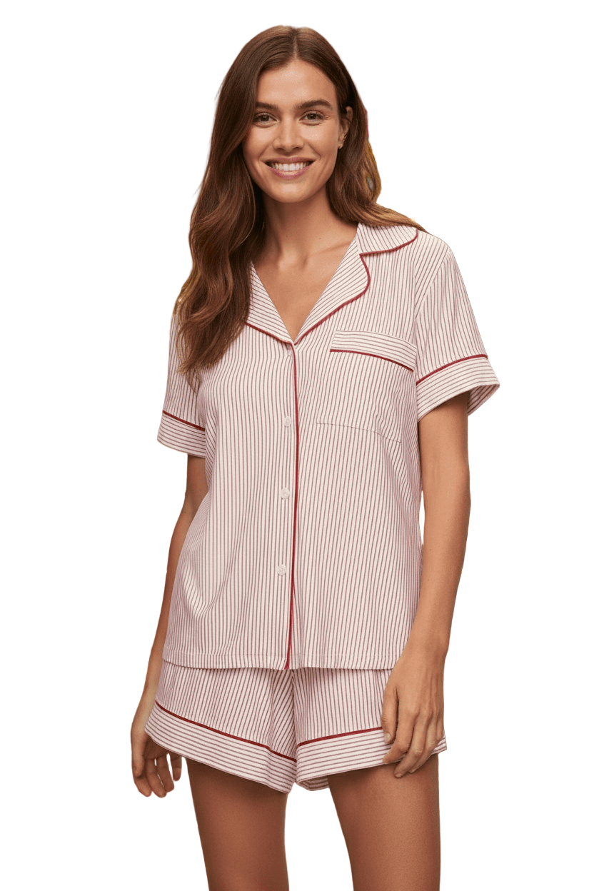 Eberjey Gisele Long PJ Set Color: Navy/Ivory, Delphinium/Ivory, Ivory/Navy, Haute Red/Bone, Charcoal Heather / Sorbet Pink, Heather Grey/Sorbet Pink, Black/Sorbet, Water Blue/White, Graphite/Sorbet, Bellini/Bright Pink, Light Orchid/Ivory, Bright Pink/Bellini, Pearl Blush/Haute Red, Willow Green/Bone, Light Lilac/Ivory, Tulip Off White/Light Lilac, Ocean Bay/Ivory Size: XS, S, M, L, XL at Petticoat Lane  Greenwich, CT