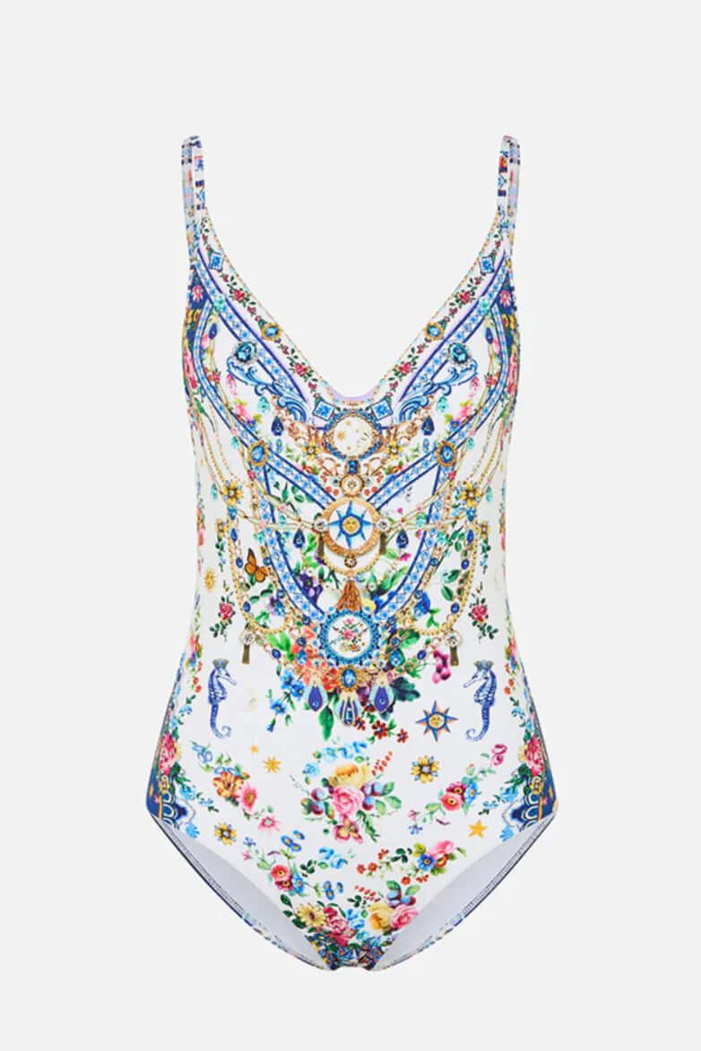 The Tiles Darls Wired V Neck One Piece by CAMILLA features tile-inspired prints, underwire support for C-cups, adjustable straps, and crystal accents for a refined, sculpted fit.